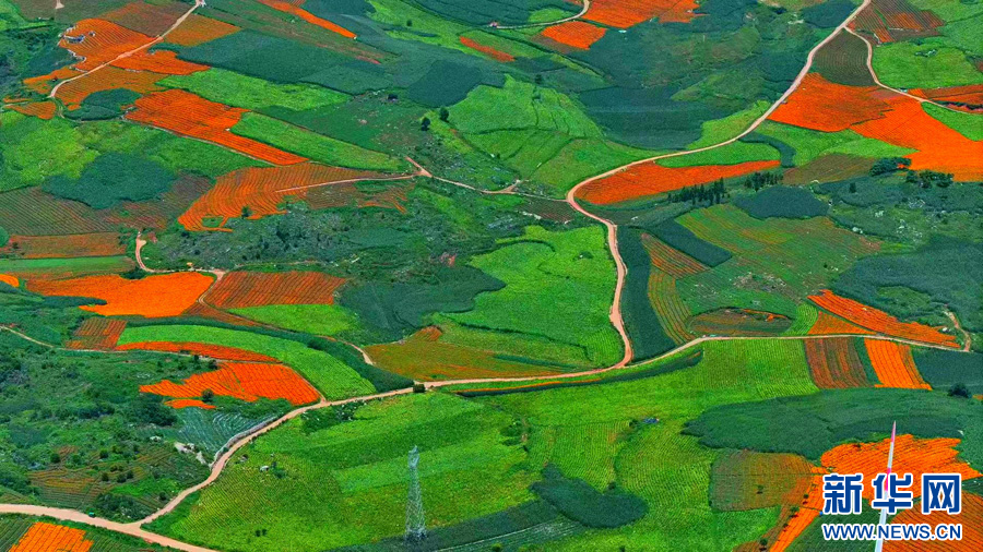 航拍萬壽菊花田(8月14日攝)。新華網發(張天宇 攝)