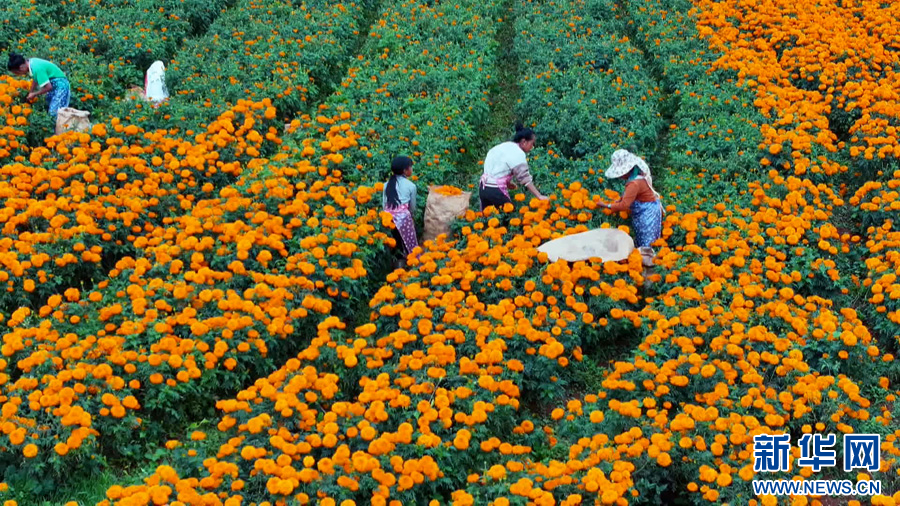 農戶采摘萬壽菊(8月14日攝)。新華網發(張天宇 攝)