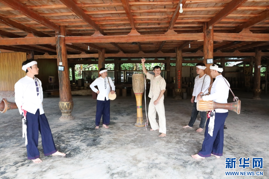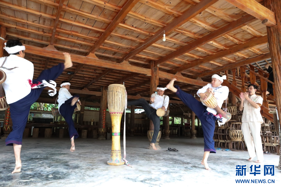 8月16日,波罕丙(右一)帶領徒弟練習象腳鼓舞。新華網發(李云生 攝)