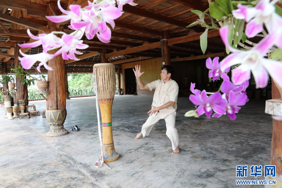 初秋雨后的清晨,雨林環抱中的云南省西雙版納傣族自治州勐臘縣勐臘鎮曼旦村,傳來節奏明快的象腳鼓聲。這是國家級非物質文化遺產代表性項目傣族象腳鼓舞代表性傳承人波罕丙正在指導徒弟們練習象腳鼓舞。2012年,波罕丙在自己家成立傳習所教授徒弟。