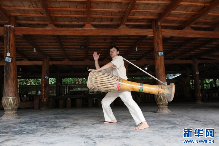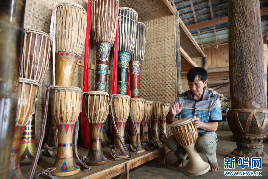 8月16日,波罕丙查看象腳鼓。新華網發(李云生 攝)