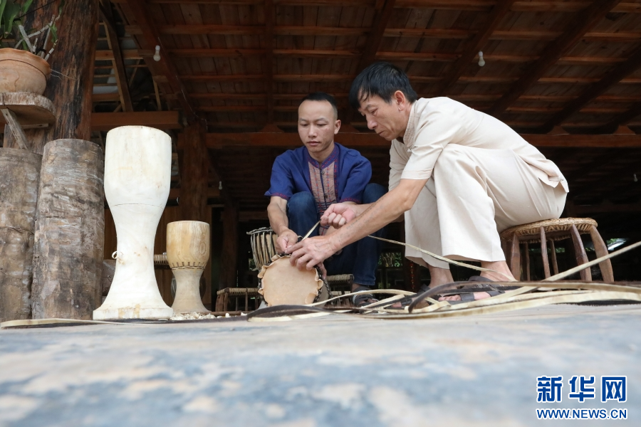 8月16日,波罕丙(右)與兒子巖罕丙一同制作象腳鼓。新華網發(李云生 攝)