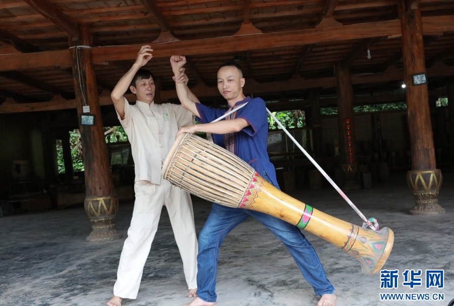 8月16日,波罕丙(左)為兒子巖罕丙講解象腳鼓舞要領。新華網發(李云生 攝)