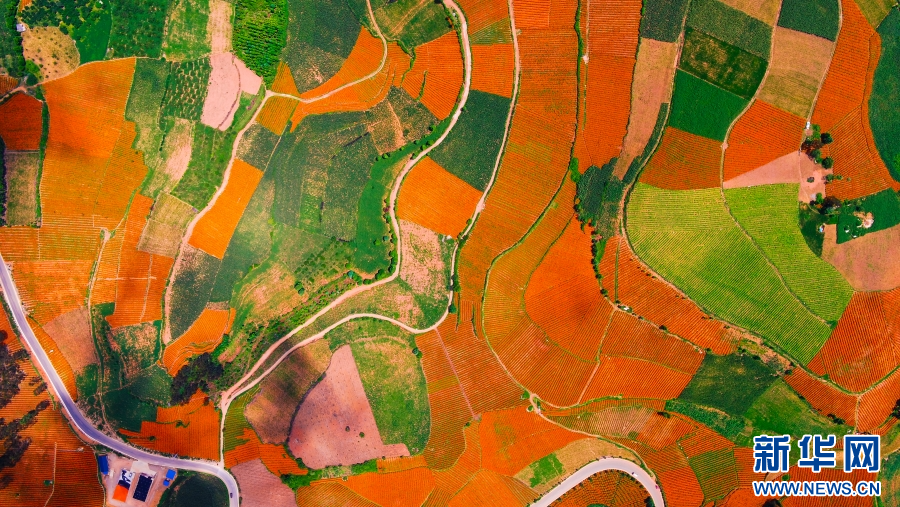 高空俯瞰萬壽菊花田(8月19日攝)。新華網發(李偉健 攝)