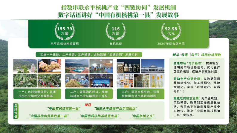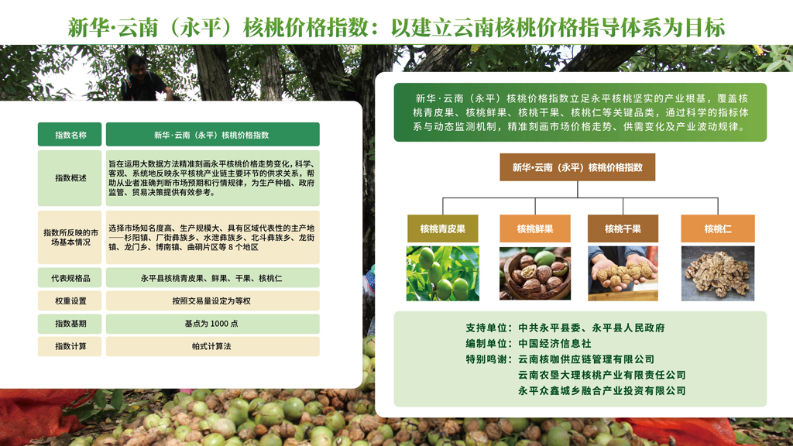 8月22日,由中國經濟信息社與云南省大理白族自治州永平縣人民政府聯合打造的“新華?云南(永平)核桃價格指數2025”,在云南昆明正式發布。指數覆蓋核桃青皮果、鮮果、干果、核桃仁四大品類,采集杉陽鎮、廠街彝族鄉等8個主產地交易數據,形成動態監測體系,為相關產業政策的制定提供精準數據支撐,為全國高原特色產業的數字化發展提供寶貴經驗。