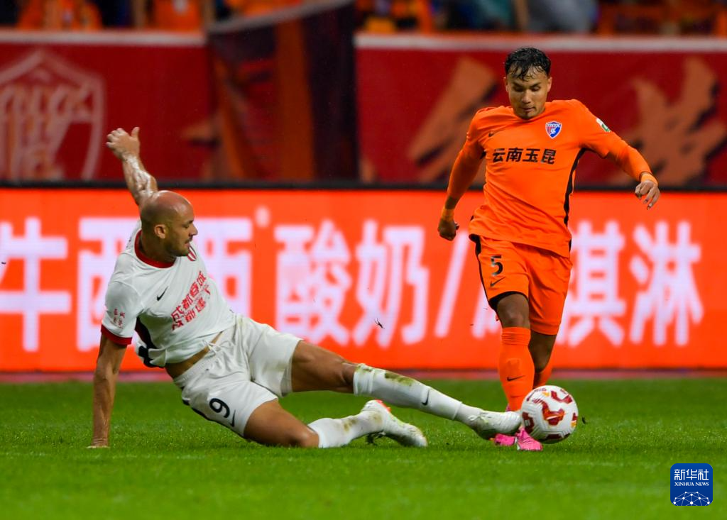 8月23日,云南玉昆隊球員葉楚貴(上)在比賽中拼搶。新華社記者 陳欣波 攝