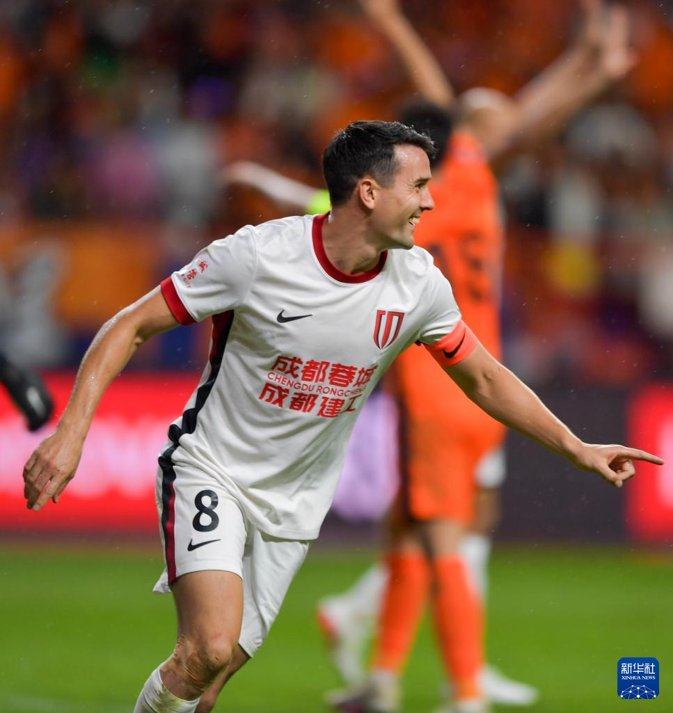 8月23日,成都蓉城隊球員周定洋在比賽中慶祝進球。新華社記者 陳欣波 攝