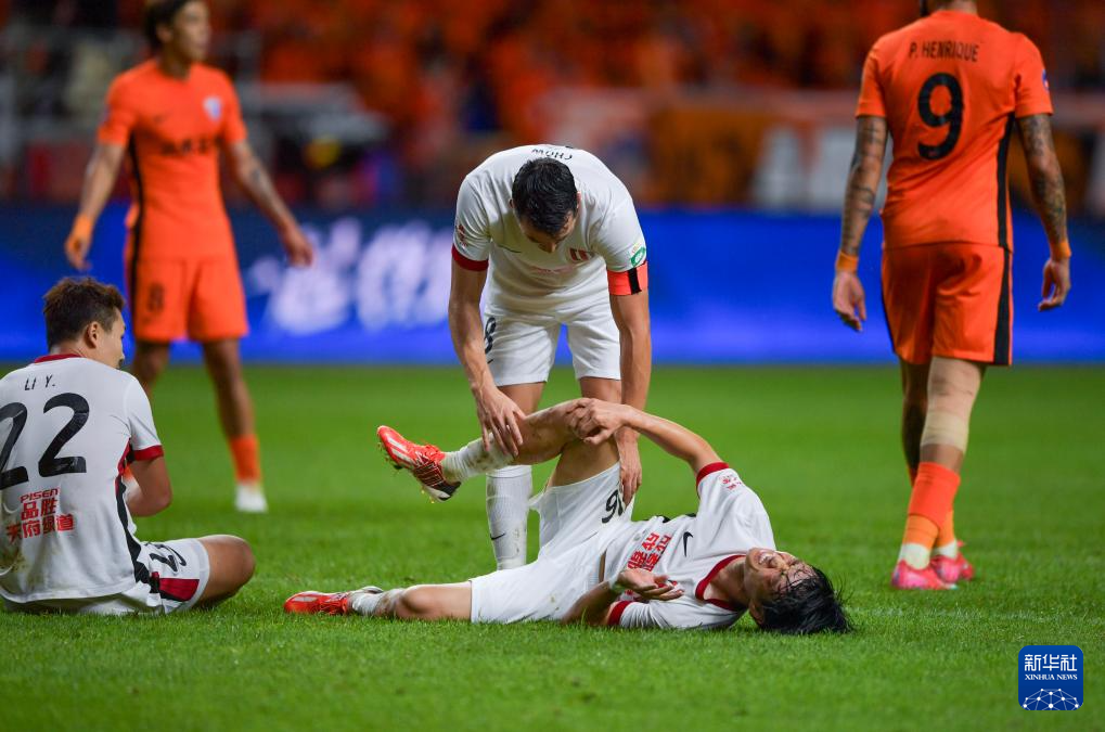 8月23日,成都蓉城隊球員楊明洋(下)在比賽中受傷。新華社記者 陳欣波 攝