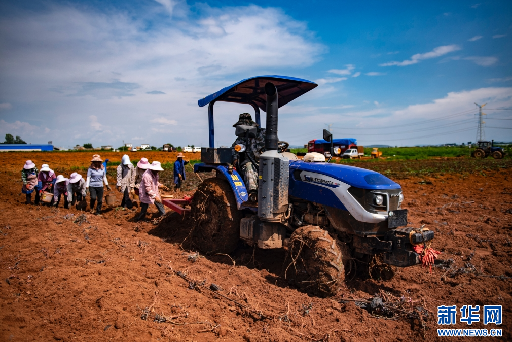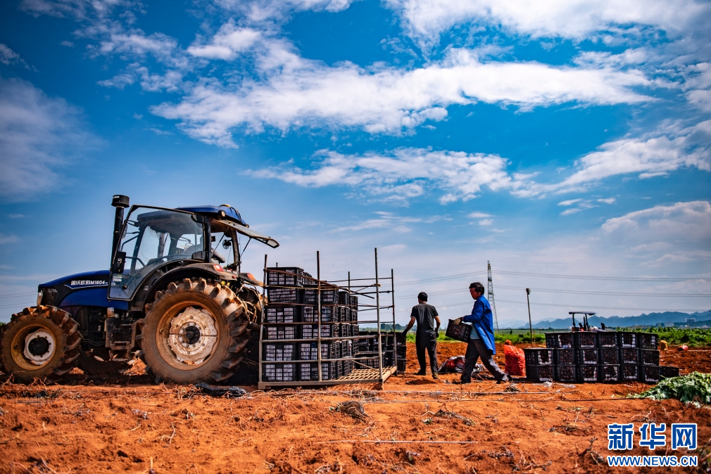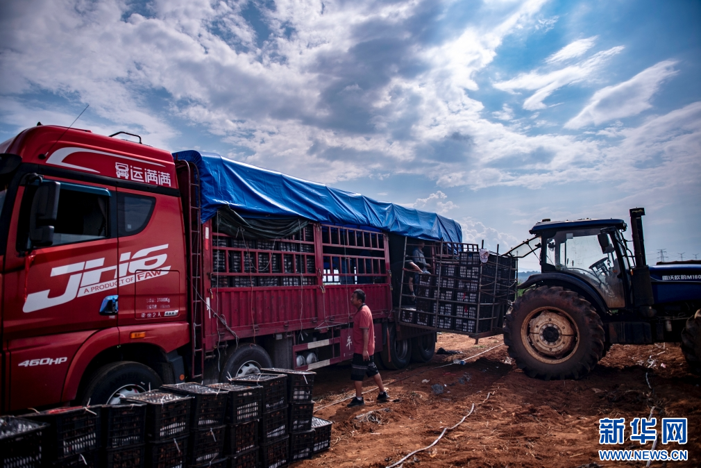在云南省硯山縣石碑寨村,村民將采收好的紅薯裝車(8月17日攝)。新華網發(熊平祥 攝)