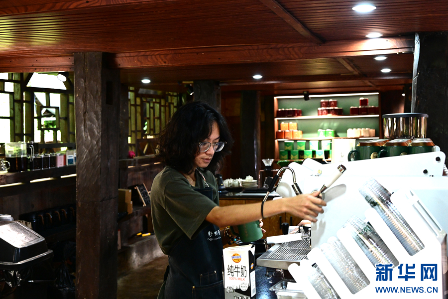 在野鴨塘河谷·景邁山店,工作人員正在沖泡咖啡(8月26日攝)。新華網發(劉起 攝)