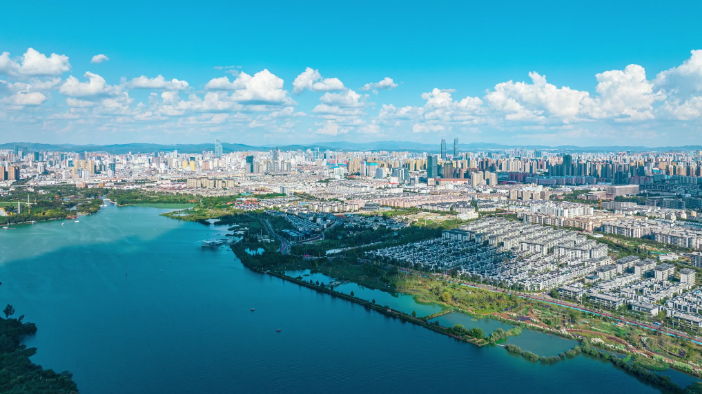 初秋時節,航拍鏡頭下的昆明盡展高原明珠的獨特魅力。碧空澄澈,白云舒卷,滇池如鏡,與城市天際線相映成輝。