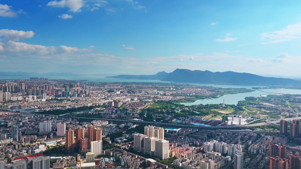 西山巍峨聳立,勾勒出壯闊背景;街道縱橫,樓宇林立,現代都市的繁華與湖光山色交織輝映。山水相依、生態宜居的畫卷在眼前徐徐鋪展。