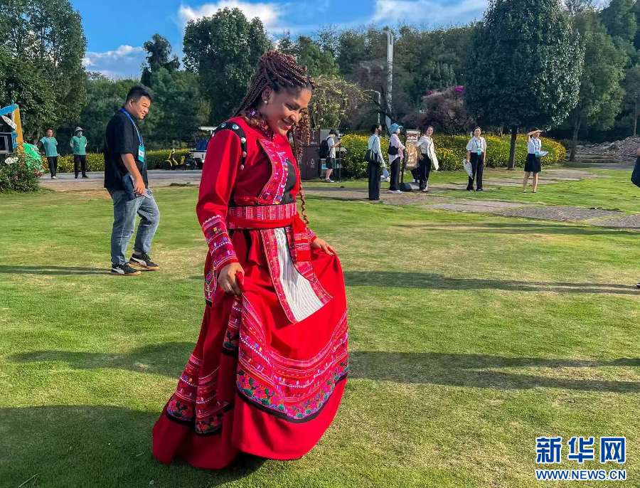 換上當地民族服飾,來自赤道幾內亞的《真實赤幾》雜志社長米拉格羅薩對著鏡頭擺起了舞蹈動作,她喜歡這里?!拔液芟矚g中國傳統服飾,每次穿上都感覺很開心?!泵桌窳_薩說。