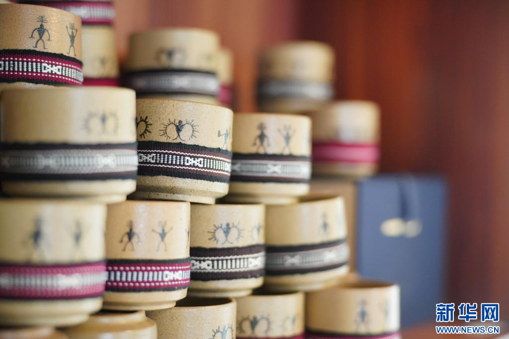 這是在白沙坡村民小組佤族織錦工坊拍攝的帶有佤族織錦裝飾的咖啡杯(9月17日攝)。新華網發(高詠薇 攝)