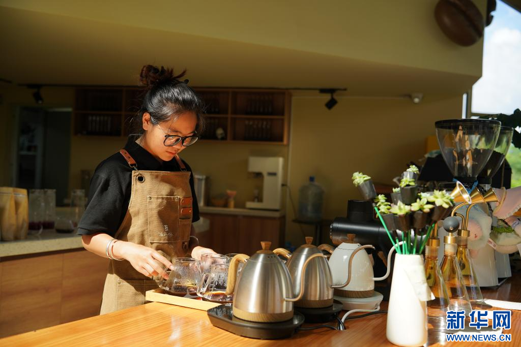 工作人員在白沙坡村民小組“美麗星村·有風咖谷”咖啡體驗中心制作咖啡(9月17日攝)。新華網發(高詠薇 攝)