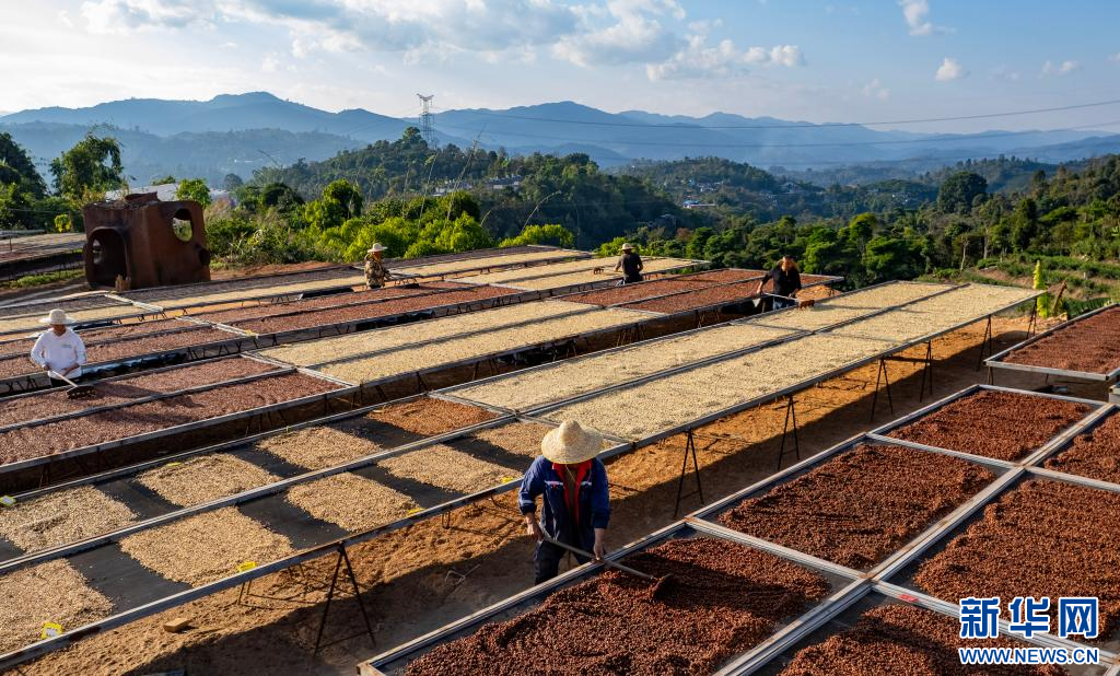 圖為1月7日拍攝的工作人員在云南省普洱市思茅區大開河梅子咖啡莊園的咖啡曬場翻曬咖啡(無人機照片)。 新華社記者 陳欣波 攝