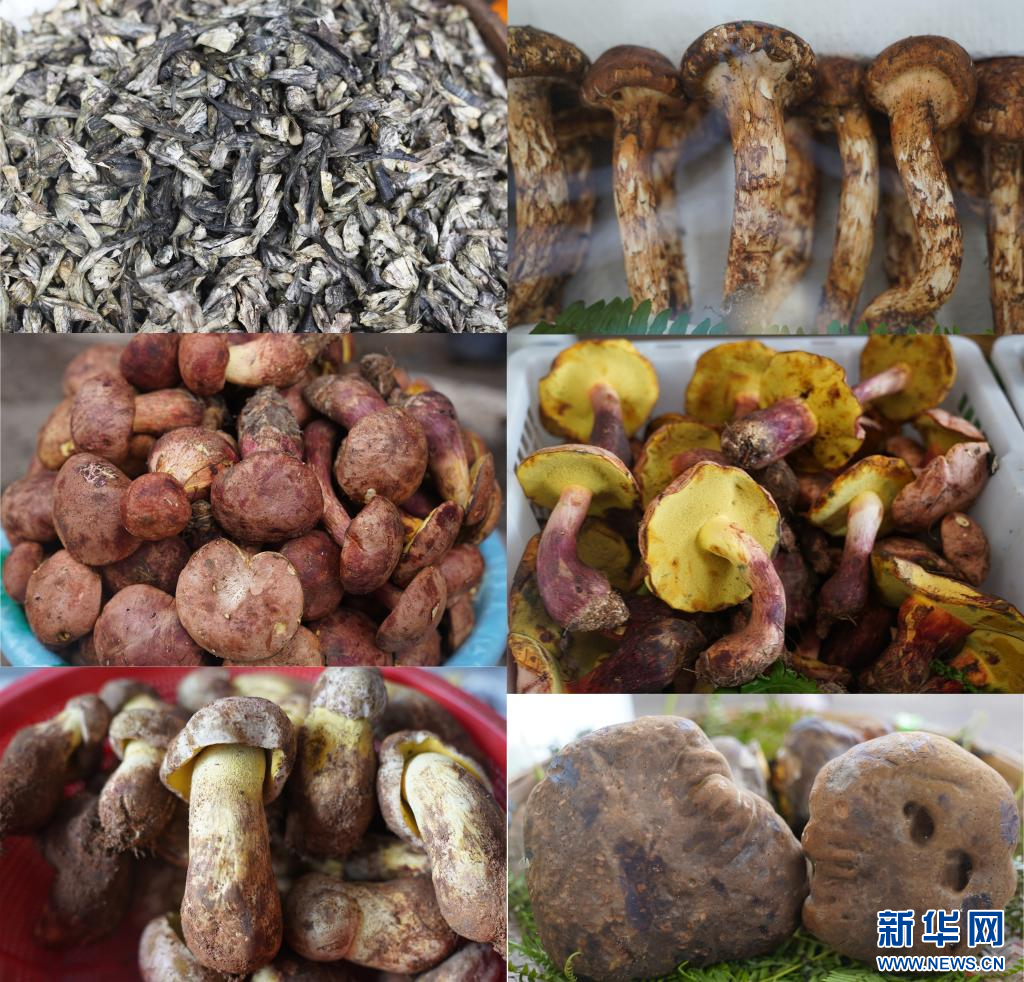 6月15日在昆明一處野生菌交易市場拍攝的野生菌(拼版照片)。新華社發(梁志強攝)