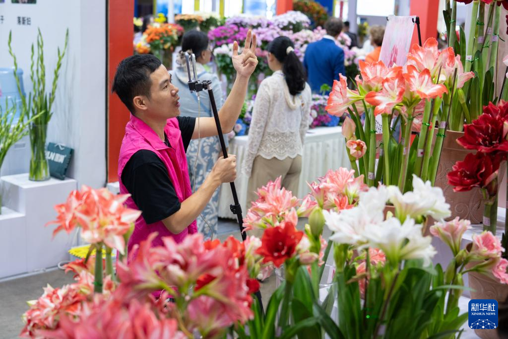 9月19日,參展商在第二十三屆中國昆明國際花卉展直播推介花卉。新華社記者 高詠薇 攝