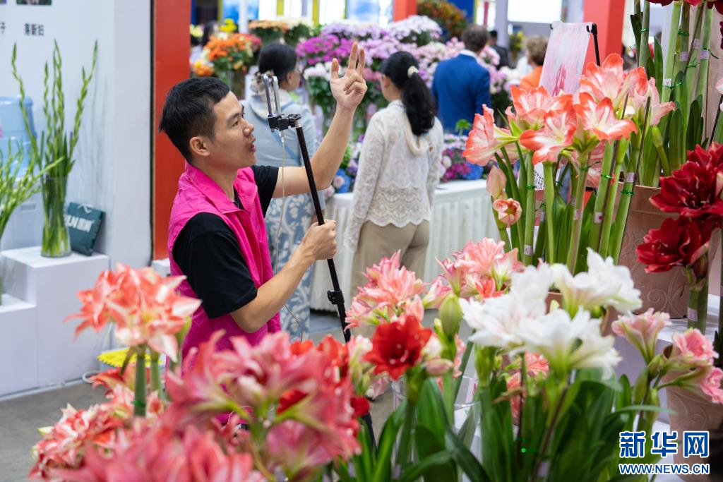 9月19日,參展商在第二十三屆中國昆明國際花卉展直播推介花卉。新華社記者 高詠薇 攝