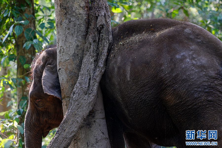 亞洲象來回蹭樹,為肩部止癢(3月11日攝)。新華網發(徐華陵 攝)