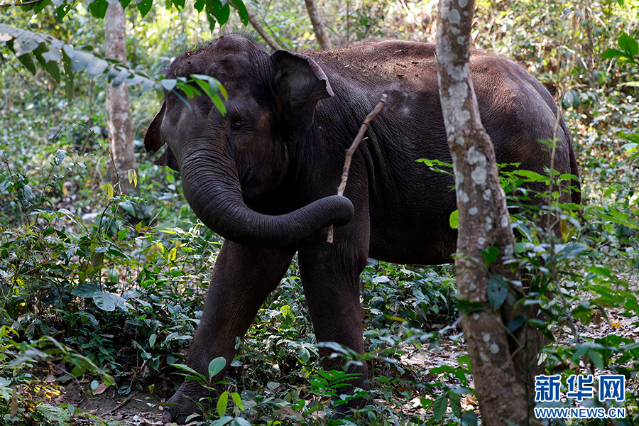 亞洲象用鼻子卷起樹枝,戳向皮膚達到止癢效果(3月11日攝)。新華網發(徐華陵 攝)