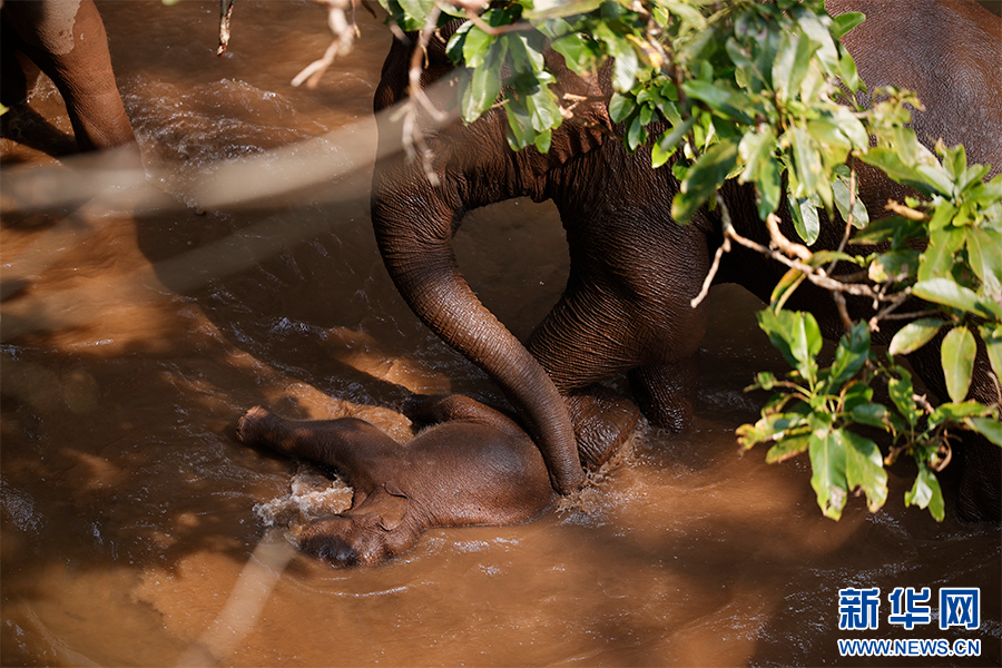 在河流里洗澡的野生亞洲象(3月4日攝)。新華網發(徐華陵 攝)
