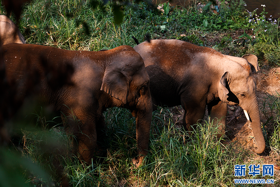 亞洲象用泥土覆蓋身體,防止蚊蟲叮咬(3月4日攝)。新華網發(徐華陵 攝)