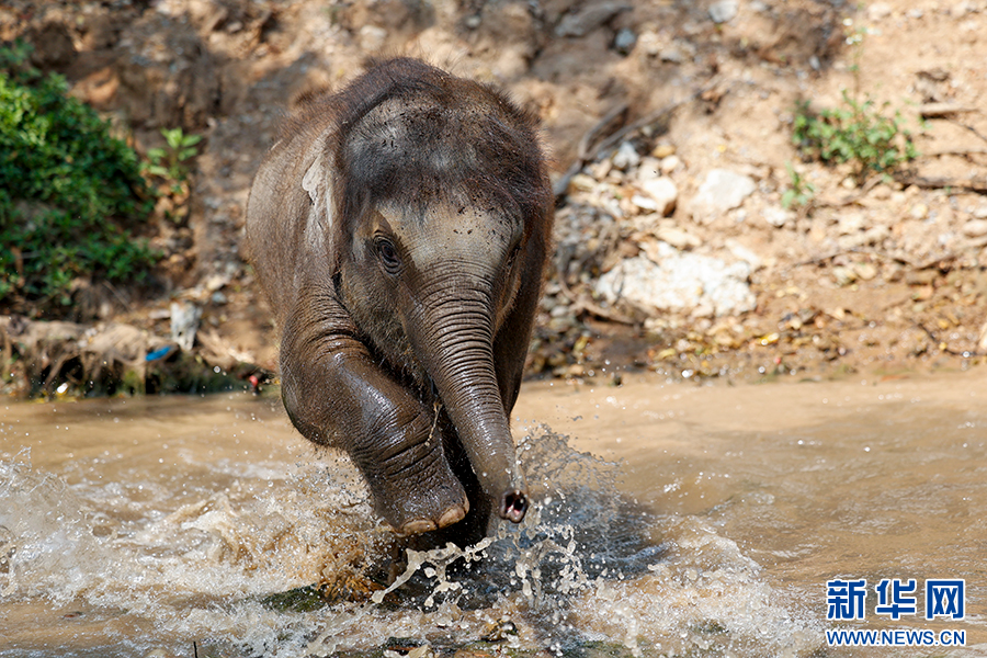 亞洲象幼象正在愉快玩水(3月11日攝)。新華網發(徐華陵 攝)