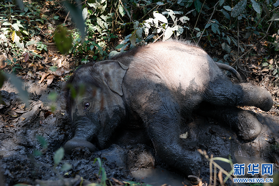 一頭幼象在泥塘里打滾(3月5日攝)。新華網發(徐華陵 攝)