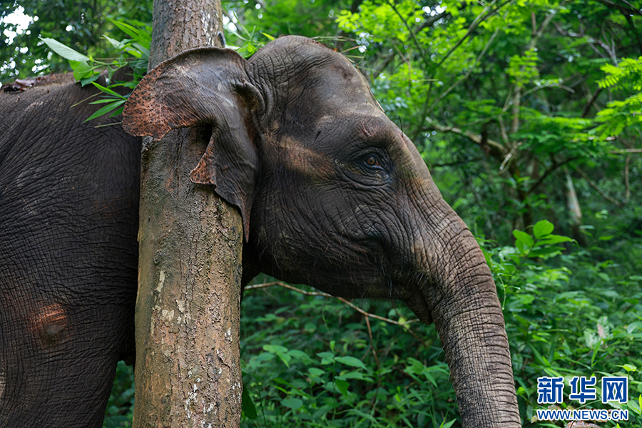 亞洲象正在野外蹭樹,研究人員可根據它留下的痕跡判斷大致身高等信息(6月24日攝)。新華網發(徐華陵 攝)