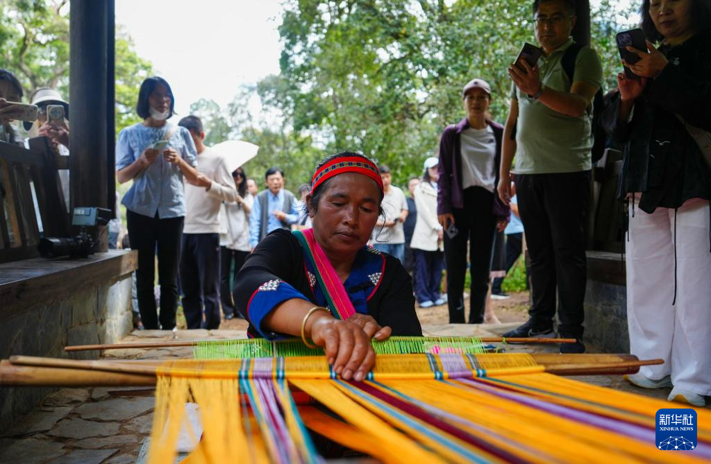 9月27日,一名當地村民在景邁山大平掌古茶園為游客展示織錦技藝。新華社記者 陳欣波 攝