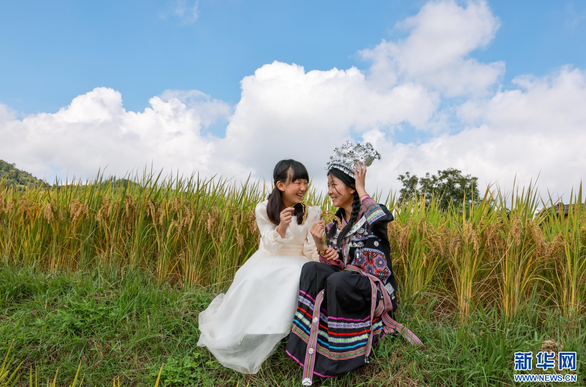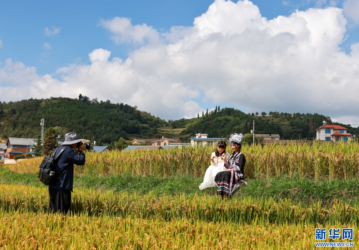 游客在稻田中游玩拍照(10月5日攝)。新華網發(孫文來 攝)