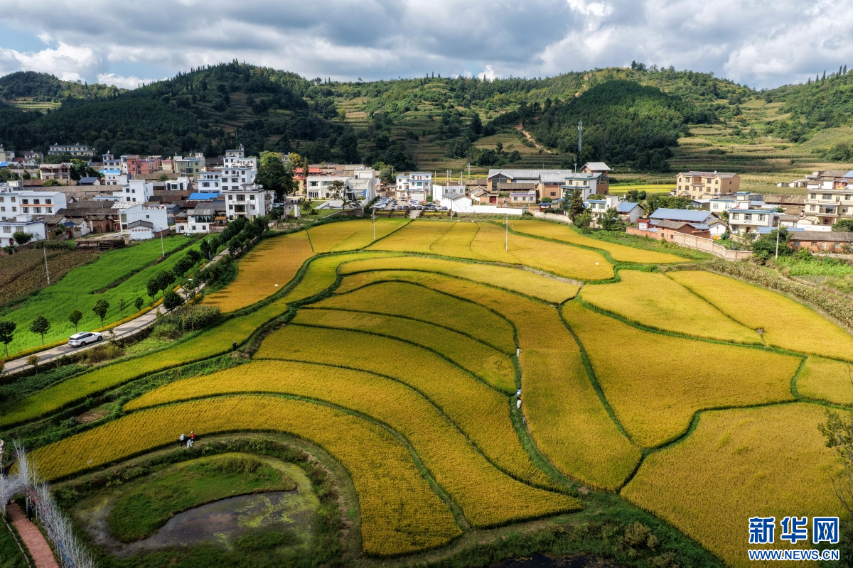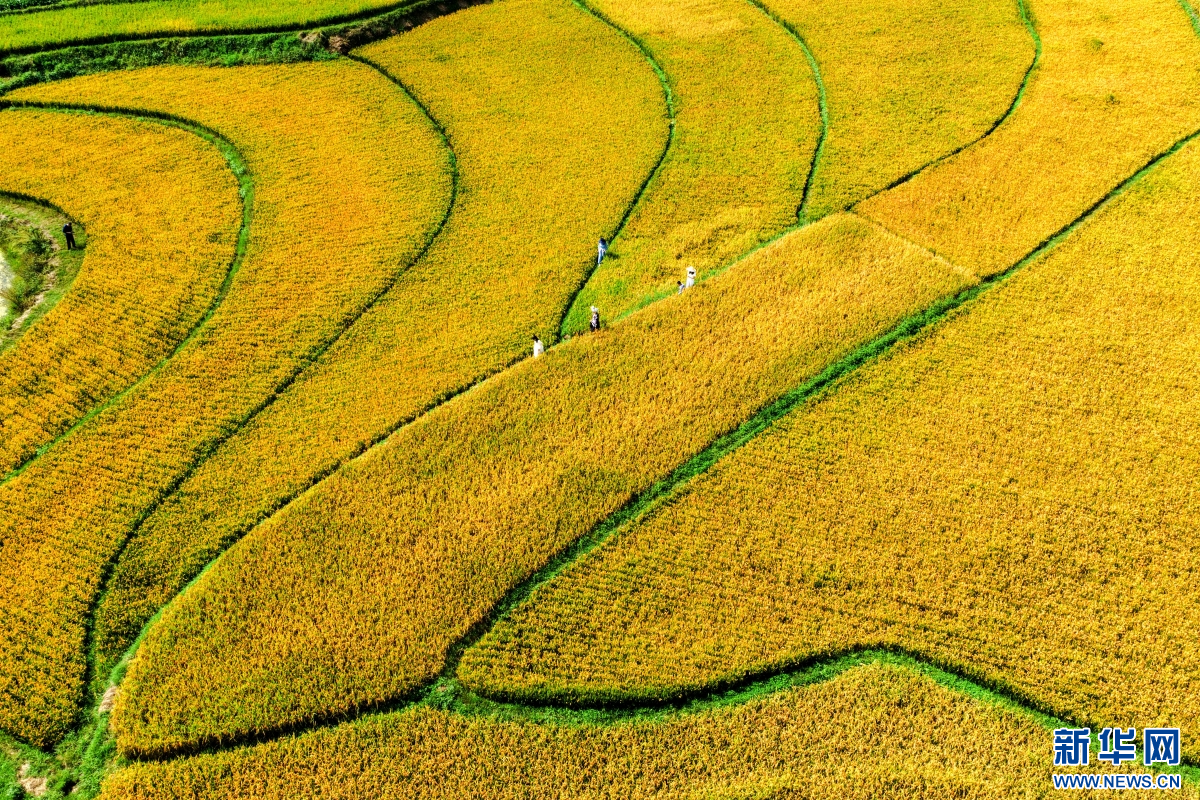 秋日里,云南省曲靖市沾益區龍華街道紅瓦房村,稻浪層層翻滾,在陽光照耀下泛起金光??罩懈╊?,田埂縱橫交錯,勾勒出優美的線條,吸引游客前來游玩欣賞,放松休閑。(孫文來)