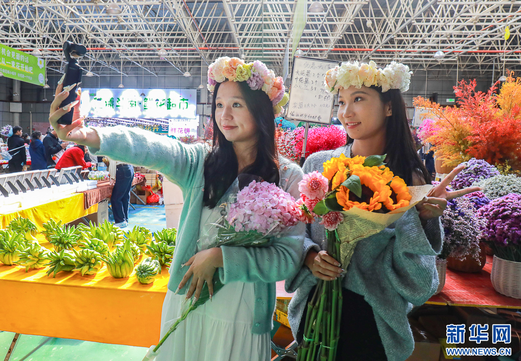 游客在昆明斗南花卉市場拍照打卡(10月1日攝)。新華網發(鄭益 攝)