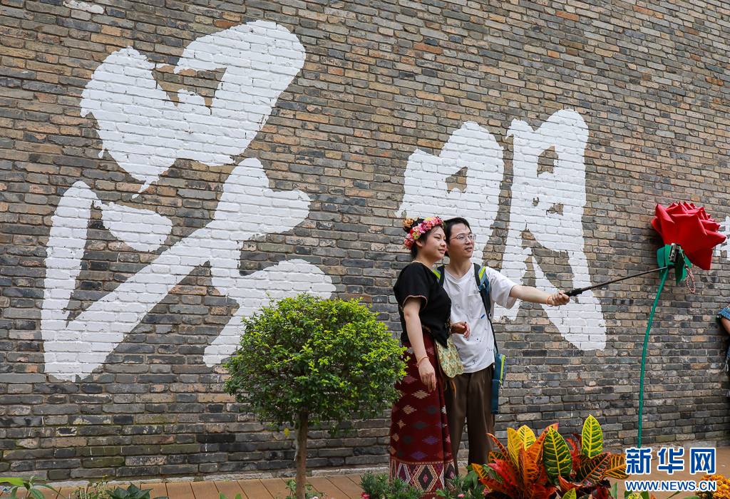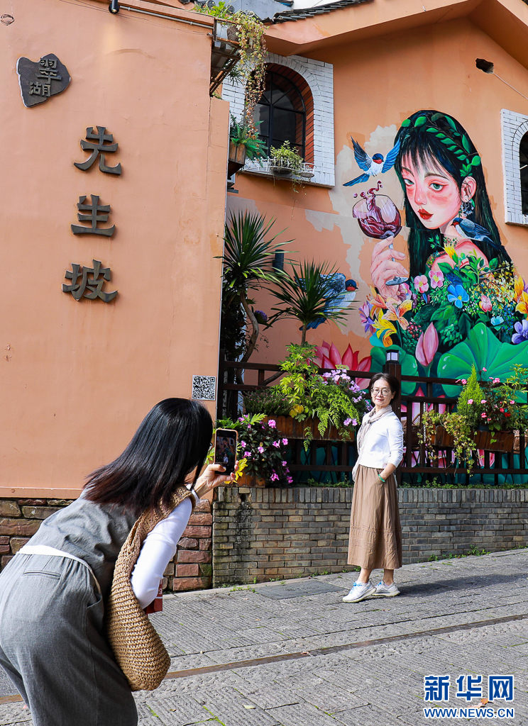 游客在昆明老街網紅打卡墻拍照(10月4日攝)。新華網發(鄭益 攝)
