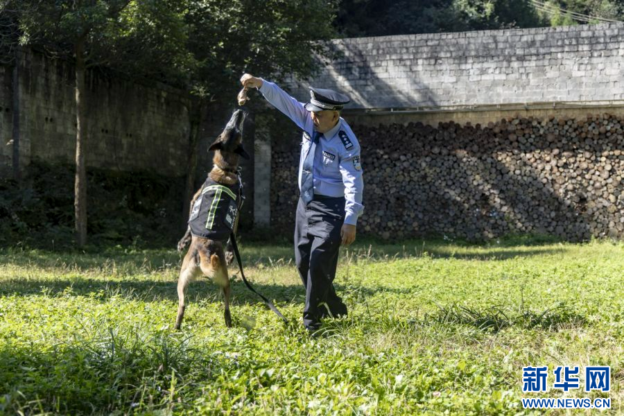 民警何德敏與警犬“無情”(10月11日攝)。新華網發(昭通市公安局供圖)