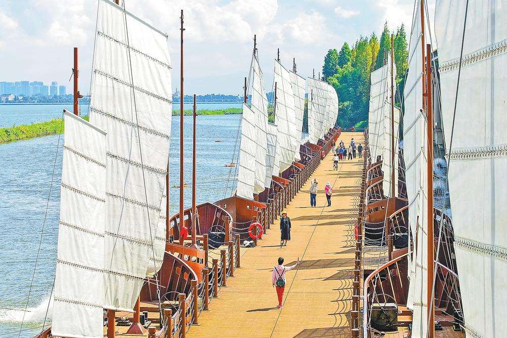 近日,昆明滇池綠道環草海段鋼浮橋重新向公眾開放。該橋是云南省首座大型鋼浮橋,全長260米,以24組“帆船”造型藝術化再現“百舸爭流、千帆競發”的滇池古渡意象。該浮橋在2023年建成后曾對公眾開放過一段時間,后處于封閉狀態。此次重新開放,讓市民游客得以完整體驗環滇池的自然風光與人文景觀。