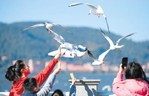 10月15日,海埂東碼頭上出現了百余只紅嘴鷗的身影,這是來昆越冬紅嘴鷗的先頭部隊。市民和游客興奮地投喂它們,這也意味著一年一度的昆明觀鷗季開始了。