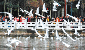 游客在翠湖公園喂紅嘴鷗。記者 黃曉松 攝