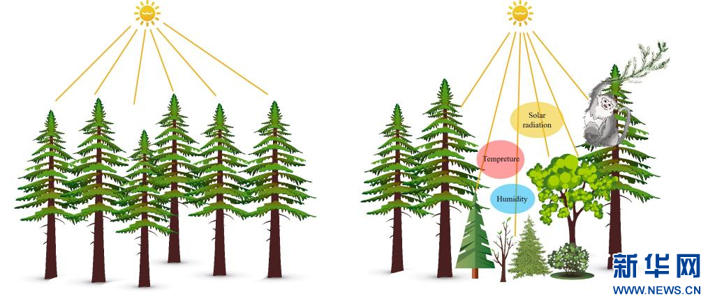 沒有滇金絲猴的區域,林窗較小,植物群落單一(左圖);滇金絲猴活動的區域,因其取食等行為折斷林冠樹枝,增大林窗,改變林下氣候條件,增加了生物多樣性且優化了森林結構(右圖)。繪圖者:李娜