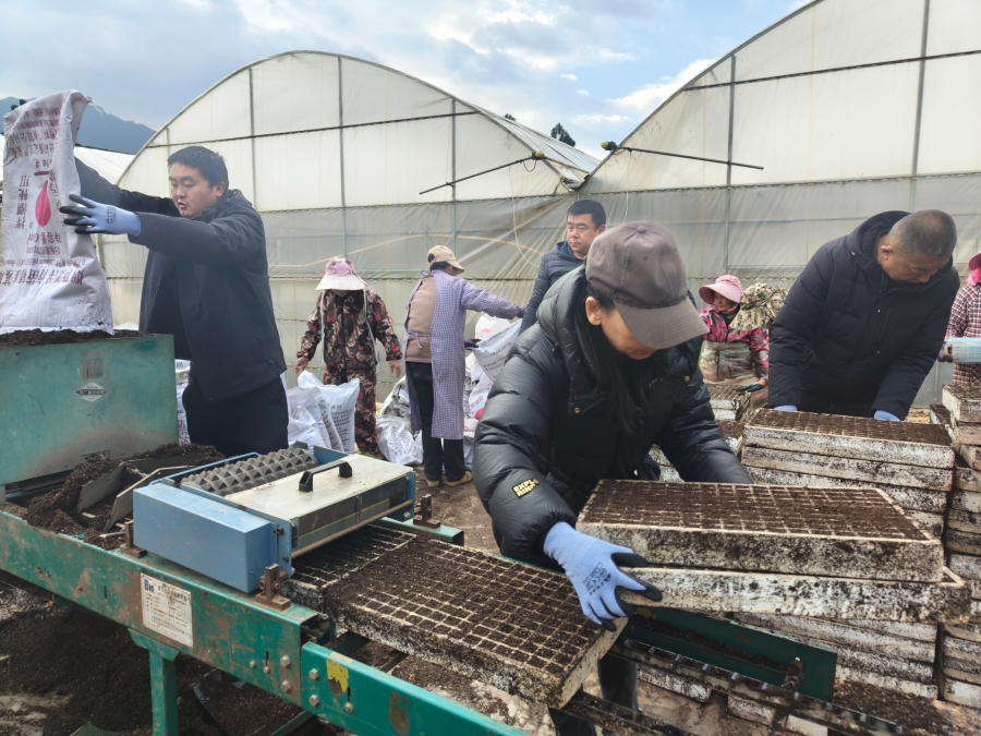 工作人員協助煙農搬運與整理育苗盤(2月19日攝)。王瓊 攝